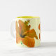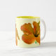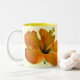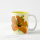 Une ketmie assez orange et jaune fleurit en soleil tropical sur cette tasse de café.