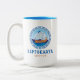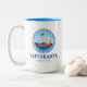 Leptokarya, tasse à café à deux tons de Grèce avec un design d'un navire grec ancien et des lettres de style grec. Ce modèle de navire de la Grèce antique a la clé grecque dans un design circulaire avec la mer et le ciel. Ce design de style grec fait de cette tasse un cadeau ou un souvenir idéal ou pour boire un café pendant vos vacances à Leptokarya.