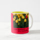 C'est une belle tasse avec un jaune intérieur et le rouge sur l'extérieur avec une image régénératrice des tulipes de ressort et l'énonciation célèbre "douches d'avril apportent des fleurs de mai"