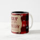 Cette tasse à café personnalisée présente un thème festif de Noël. L'arrière - plan dispose d'un motif de plaid de Buffalo rouge rustique parsemé de flocons de neige. Une affiche vintage en papier parchemin est imprimée au centre et encadrée d'une bordure en feuille d'or. L'expression "Mangez Boire et Soyez Joyeux" est imprimée en haut dans une police rouge bordeaux, suivie d'un exemple de nom de famille. Vous pouvez personnaliser la tasse pour inclure votre propre nom personnalisé ou un autre texte.