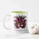This ceramic coffee mug is shown with Mardi Gras images, Text of "Let the good times roll' is beneath the prints.