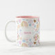 Une tasse avec un motif mignon et fantaisiste. Des ballons à air chaud et des nuages mignons avec des visages parmi les étoiles, les cœurs et les ballons. Des couleurs pastel douces composent ce design adorable. Un carré blanc superposé avec votre texte à l'intérieur.