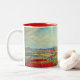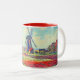 Mug à café à deux tons avec peinture de la fleur et du moulin de Claude Monet. De beaux champs colorés de tulipes rouges, roses et jaunes à côté d'un moulin et d'une maison en Hollande. Un grand cadeau Monet pour les amateurs d'impressionnisme et d'art français.
