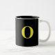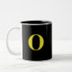 Cette tasse de café est noire sur base blanche. Un monogramme est placé au centre pour vous permettre de personnaliser. Voici un exemple de monogramme d'un "O" en jaune vif. Intérieur noir. Modifier les couleurs, l'intérieur, le texte, etc. .