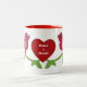 Mug avec une jolie paire d'oiseaux rouges avec des accents cardiaques et du texte pour customiser avec des noms choisis ou un autre message. Conception sucrée pour les jeunes mariés, la Saint-Valentin ou la fête la plus douce.