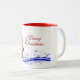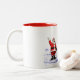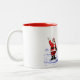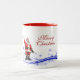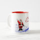 Dessin humoristique du Père Noël sur un arrière - plan bleu enneigé. Tasse à café de Noël très mignonne et amusante.