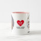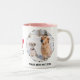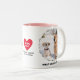 Mug commémoratif mignon pour un animal de compagnie bien-aimé avec deux photos personnalisées, nom et dates de naissance et de décès. Il y a un cœur rouge au milieu de la tasse avec la phrase "En mémoire aimante" (modifiable) ainsi qu'une zone en dessous pour le texte personnalisé.