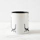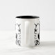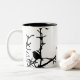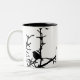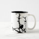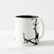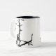 Cette tasse d'art contemporain présente une silhouette noire et blanche abstraite moderne motif d'un Junco aux yeux foncés (Junco hyemalis) perché sur une branche nue, dans un arbre. Cet oiseau est en fait une sorte de petit moineau gris et blanc. La conception est répétée sur les côtés droit et gauche.