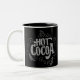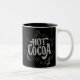 Cette tasse de cacao chaud à tableau noir comporte du lettrage à la craie qui dit "cacao chaud" sur un arrière - plan de tableau noir faux. Le tableau est entouré d'un cadre en bois. (Le tableau et le cadre sont tirés d'une photographie. Il n'y a pas de cadre réel) Le lettrage présente des swashes décoratifs et des tourbillons ornementaux.
