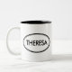 Vérifiez cette tasse de Theresa ! Votre nom est-il Theresa ? Ou avez-vous une épouse, une amie, un membre de la famille féminin ou un ami féminin appelés Theresa ? Si oui, cette tasse "de timbre nommé" est exactement le cadeau que vous recherchez ! Les caractéristiques de conception "Theresa" dans le grand lettrage noir entouré par deux ovales, un mince et un épais.