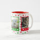 Personnalisez facilement cette adorable tasse de vacances avec les noms de vos trois animaux de compagnie (avec des cœurs) et leurs photos dans deux cadres rouges et un cadre vert central sur de mignonnes empreintes de pattes rouges et vertes - "Pawesome!"