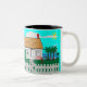 Maison avec clôture au bord de l'eau de la plage avec arbres et fleurs tout autour. Le cadre montagnard de l'arrière - plan. Deux femmes à l'extérieur font du sport tandis qu'une femme regarde par la fenêtre pendant que la radio joue. Le chien aboie au flamingo ambulant et le voilier passe tranquillement par.