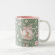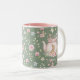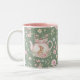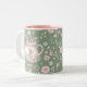 Whimsical Bunny Teapot Floral Spring Two-Tone Coffee Mug. This design features a delightful whimsical bunny nestled within a pink teapot, surrounded by spring blossoms and green foliage. This floral pattern brings a touch of spring magic to your everyday sips. Perfect for tea, coffee, or hot cocoa, it makes a delightful gift for Easter, Mother's Day, birthdays, or any occasion for a bunny lover.