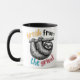 Une tasse à café présentant la phrase "Pause loin de la routine" en lettres grasses, accompagnée d'un graphique de paresseux détendu, symbolisant un mode de vie lent et insouciant et l'importance de prendre du temps pour soi.