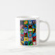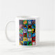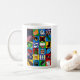 Une tasse à café avec une grille d'objets kiwiana représentés dessus de chaque côté de la tasse. © Radenbrea Studios sur Zazzle, Une superbe tasse à offrir en cadeau, ou pour quiconque aime la Nouvelle-Zélande.