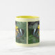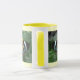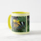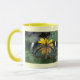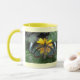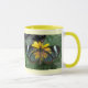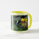 Papillon avec les ailes transparentes, descendues sur la fleur jaune lumineuse. Photo des deux côtés de tasse avec la poignée jaune lumineuse.