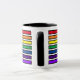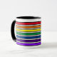 Les couleurs de l'arc-en-ciel remplissent les contours noirs de barres régulièrement espacées, du rouge en haut au violet en bas. La tasse blanche apparaît dans les espaces entre.