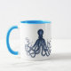 Tasse de café personnalisée élégante avec l'illustration vintage d'un poulpe fait dans le bleu, des deux côtés de la tasse. Personnalisez le texte bleu, au milieu, pour lire quelque chose que vous voulez. Grande tasse pour la maison ou le bureau.