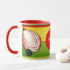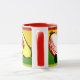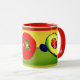 Tasse colorée avec avocat, tomate et oignon sur fond vert et or.