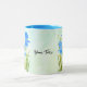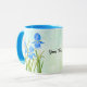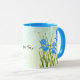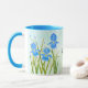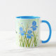 Une tasse avec des images de beaux iris bleus. Le fond, l'image et le texte peuvent être personnalisés. Œuvre originale de W.B.