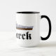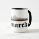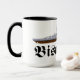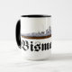Tasse avec dessin du célèbre cuirassé allemand Bismarck de la seconde guerre mondiale avec le nom du navire écrit en lettres fraktur.