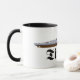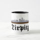 Tasse avec dessin au trait du cuirassé allemand Tirpitz de la seconde guerre mondiale, navire jumeau du Bismarck, avec le nom du navire écrit en lettres de fracture.