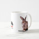 Une tasse avec le nom et le logo de BunnyLuv d'un côté et de l'autre une image de PETRA, qui est presque 11 années et amours creusant dans le foin et se blottissant avec ses amis de lapin.