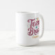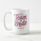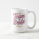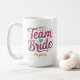 Notre tasse de café personnalisée présente la phrase "mariée d'équipe" en typographie de paillettes avec des éléments fantaisistes en bordeaux, aqua et or pour un cadeau de douche amusant pour vos demoiselles d'honneur pour célébrer votre ère de mariée !
