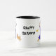 Une tasse de café blanc avec une jante noire et poignée, décorée d'une danse de femme âgée et du chant, d'une peinture pour aquarelle par Judy Adamson. La femme est habillée dans des couleurs lumineuses, avec des bottes fleuries jaunes et un casquette pourpre. Elle tient un microphone et son petit chien s'associe à la danse. Le texte, dans le noir, que vous pouvez customiser, est "mamie super". Les cartes de voeux, les signets et le magnet de réfrigérateur avec la même conception sont également disponibles.