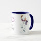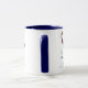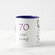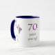 Cette tasse blanche de sonnerie, avec la lèvre et la poignée bleu-foncé fait un grand cadeau d'anniversaire pour 70 ans ! L'image, le dos et l'avant est d'une danse "d'homme plus âgé", dans un casquette de blazer et de chapeau en paille, d'une illustration pour aquarelle par Judy Adamson. Entre les deux hommes est le texte - 70 ans de jeune !
