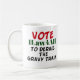 Une tasse de café avec le slogan "vote 1Law4All pour dérailler la bonne planque" là-dessus.