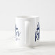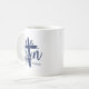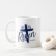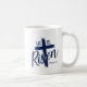 La tasse à café est présentée en bleu marine et blanc avec une impression Il est ressuscité.