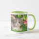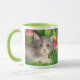 Un chaton gris et blanc minuscule se cache parmi quelques fleurs fuchsia. Illustration par Carmen Medlin.