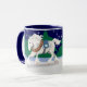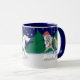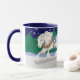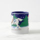 chevaux de trait gris illustrés. D'un côté un clydesdale avec un casquette et une barbe de père Noël soutient des sacs des cadeaux. De l'autre les galops majestueux d'une ébauche avec des cloches de Noël sur son collier et une colombe de blanc conçoivent sur sa selle. Scène d'hiver avec les arbres de Noël et le ciel nocturne étoilé derrière. Une belle tasse de vacances pour des amants de cheval.