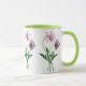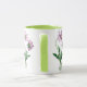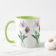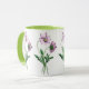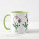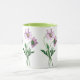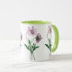L'aquarelle pourpre d'antiquité de cosmos sur une tasse en céramique classique avec gren la jante et la poignée verte.