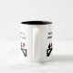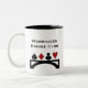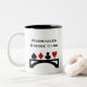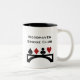 Tasse de café de joueur de pont faite dans le blanc, avec des graphiques d'un symbole noir de pont et des costumes rouges et noirs de carte, sur le dessus. Personnalisez le texte noir pour lire ce que vous voulez. Grand pour des clubs et des tournois de pont.