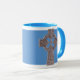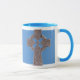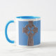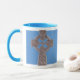 Supportant le symbole chrétien en Irlande et en Ecosse, la croix celtique est une belle expression de la foi. Ici, une vieille croix argentée a été photographiée et imprimée sur un fond bleu sur une tasse de café en céramique. La tasse de "sonnerie" est disponible dans six couleurs vient dans deux tailles - le lave-vaisselle 11oz ou 15oz et poignées sûres à micro-ondes les grandes le rendent facile de juger d'autres styles disponibles