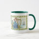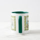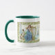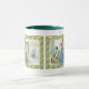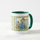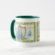 Tasse vintage de la Saint-Patrick avec texte gaélique : "Erin Mavourneen ! Sweet Erin Go Bragh !" et une belle image d'une Irlandaise jouant de la harpe avec son chien debout à côté et un navire naviguant sur l'océan à l'arrière-plan.