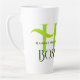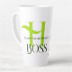 Tasse de latte à monogramme initial pour un patron. Nuances de vert avec grande initiale de la première lettre, nom complet et texte "patron". À côté du texte, une bordure de feuilles vertes tropicales et de frondes de palmier.