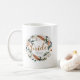 Cette tasse en céramique présente une couronne bohème à l'aquarelle avec feuillage et plume, ainsi qu'une police d'écriture ludique. Modifiez facilement le mot 'mariée' ainsi que les noms et la date pour les adapter à votre événement. Cette tasse est le cadeau idéal pour la future mariée lors de son jour spécial ou comme cadeau pour une fête de mariage.