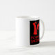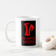 Tasse officielle de médias de Powys avec deux logos rouges sur l'arrière - plan noir