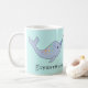 Chaque côté a un narwhal mignon avec un klaxon et des taches d'arc-en-ciel. "Tout baleine soit ok" est enroulé autour de la tasse.