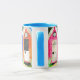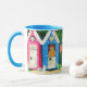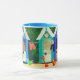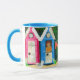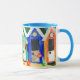 Une tasse blanche de "sonnerie" de bonne qualité avec une jante et une poignée bleues. La conception "de huttes de plage" est faite à partir d'un collage de papier peint à la main et est lave-vaisselle et coffre-fort à micro-ondes. Voir d'autres produits, cadeaux et cartes de voeux assortis.