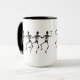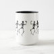 Cette tasse squelettique de danse est une nouvelle conception de jambon Wilson. La tasse a un arrière - plan blanc et une poignée noire avec une jante noire autour du dessus de la tasse. La conception montre 2 ensembles de squelettes de danse s'étendant autour de la tasse. C'est une conception drôle et unique et ferait un excellent cadeau