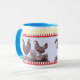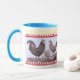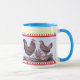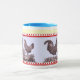 Tasse unique comportant une image antique d'un poulet et d'un coq. Le texte peut être ajouté à la bande jaune au dessus si désiré.