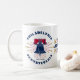 Réveillez-vous avec votre café du matin dans cette tasse patriotique célébrant le 250e anniversaire de l'Amérique. Idéal comme cadeau, souvenir et objet de collection. Elle présente une illustration de la cloche de la liberté avec des étoiles comme si elle sonnait des deux côtés gauche et droit. Un design typographique décore le centre de la tasse. Le texte indique : Philadelphie, Pennsylvanie, 1776 - 2026, et 250 Amérique, terre des braves. Joyeux anniversaire Amérique !