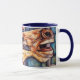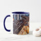 Cette jolie tasse présente ma photographie originale de la tête d'un cheval de carrousel vintage, stylisée dans une technique picturale pastel pour une apparence artistique. La poignée et l'intérieur de la tasse sont d'une teinte bleue qui complète l'œuvre d'art.