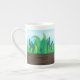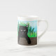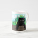Freddie Hanging fait partie de ma collection sur le thème du chat inspirée par non autre que mon bel ami en fureur ! Voici une tasse en porcelaine osseuse, illustrant un chat noir avec des pattes accrochées au-dessus d'une clôture en bois avec de l'herbe dans l'arrière - plan et un ciel bleu.