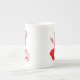 jolie porcelaine, bonne dimension effet brillant bien dans l'ensemble. Le motif et les couleurs sont réussis.Je trouve néanmoins dommage de ne pas occuper tout l'espace avc le motif car la partie rouge au dos de la tasse est trop présente et pas intéressante visuellement.