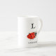 jolie porcelaine, bonne dimension effet brillant bien dans l'ensemble. Le motif et les couleurs sont réussis.Je trouve néanmoins dommage de ne pas occuper tout l'espace avc le motif car la partie rouge au dos de la tasse est trop présente et pas intéressante visuellement.